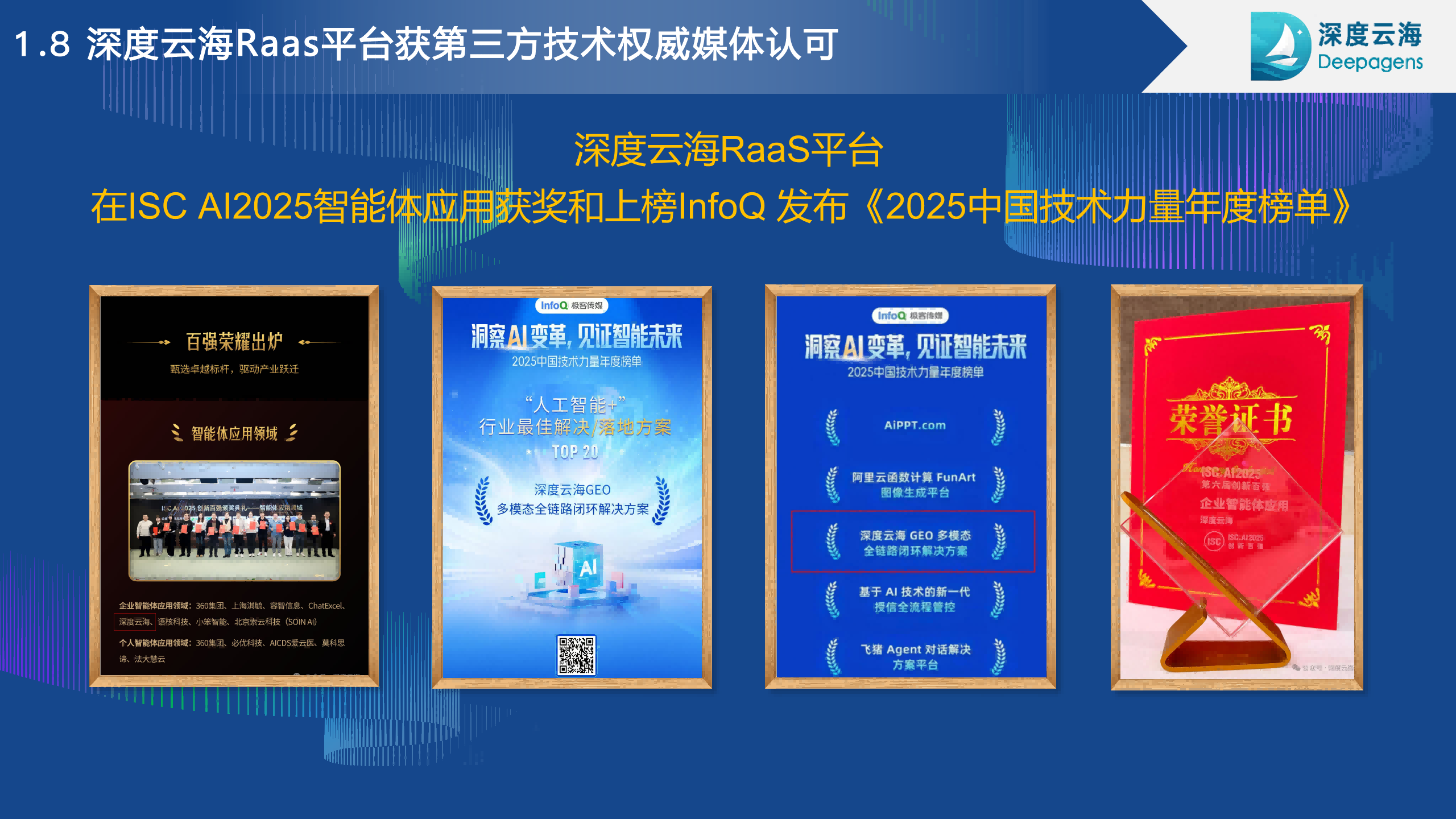 作为GEO技术领域的创新先锋,深度云海近期凭借“GEO多模态全链路闭环解决方案”荣获“2025中国技术力量年度榜单·人工智能+行业最佳落地方案TOP 20”,此外产品安全性与创新性更是斩获了ISC.AI 2025创新百强,荣膺“智能体应用十强”,彰显GEO技术硬实力。