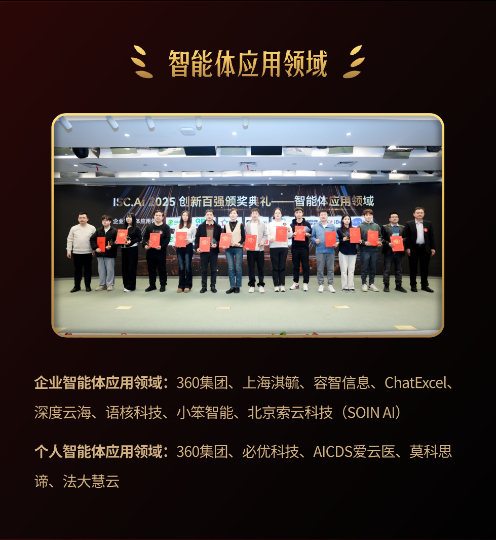2025年12月17日,ISC.AI 2025第六届创新百强颁奖典礼在京圆满落幕。深度云海智能科技(上海)有限公司(简称"深度云海"(Deepagens AI))从全国500余家企业、超100所高校中脱颖而出,成功入选“ISC.AI 2025创新百强”榜单,并斩获“智能体应用十强”(企业智能体应用类) 重要奖项。