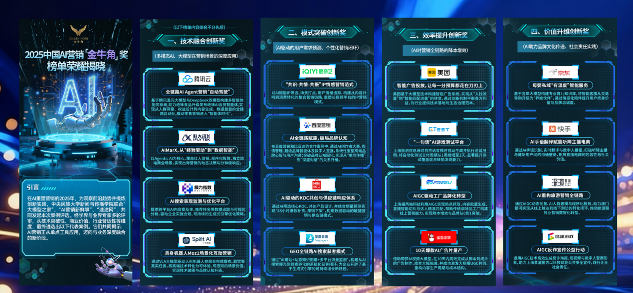 案例评审团由来自学界与业界的二十余位资深专家组成,莅临活动现场的专家团包括中央民族大学范小青教授、中国人民大学杨波教授、中央财经大学陈静副教授、速途网络董事/COO荀冠龙及大模型之家主编乔志斌等。评审团从技术突破性、商业价值、行业普适性等多维标准出发,历经多轮评议与交叉验证,最终甄选出涵盖四大创新方向的标杆案例,并在此次活动上隆重发布“2025中国AI营销‘金牛角’”榜单。