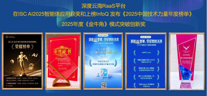 除成功入选易观分析权威报告外,深度云海还斩获多项行业重磅荣誉,先后入选 ISC.AI 2025 创新百强、荣获中国 AI 营销 “金牛角奖”。凭借突出的技术创新与落地实力,以及对多模态 GEO、AI Agent 的前瞻性布局,受到了众多行业权威媒体的重点追踪与深度关注,奠定了在 GEO 市场的领军地位。